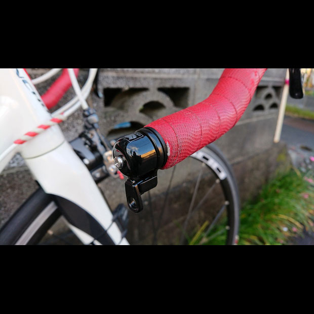 ライトやスピードメーターで混雑するハンドルの上を避けて、バーエンドにベルを付けましょう。