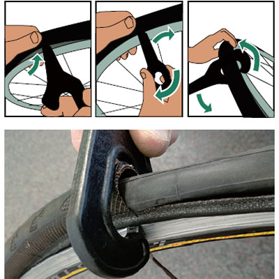 これで独自の爪(UNIQUE CLAW)という部分が、インナーチューブに触れることなく(チューブをかむことなく)タイヤの装着が完了します。 - ナイロン素材なので、アルミリムだけでなく、カーボンリムにもご使用頂けます。
