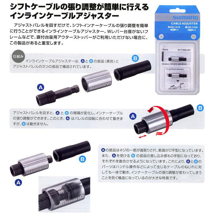 シフトワイヤーをカットし、その間に挟んで使用するアジャスターです。