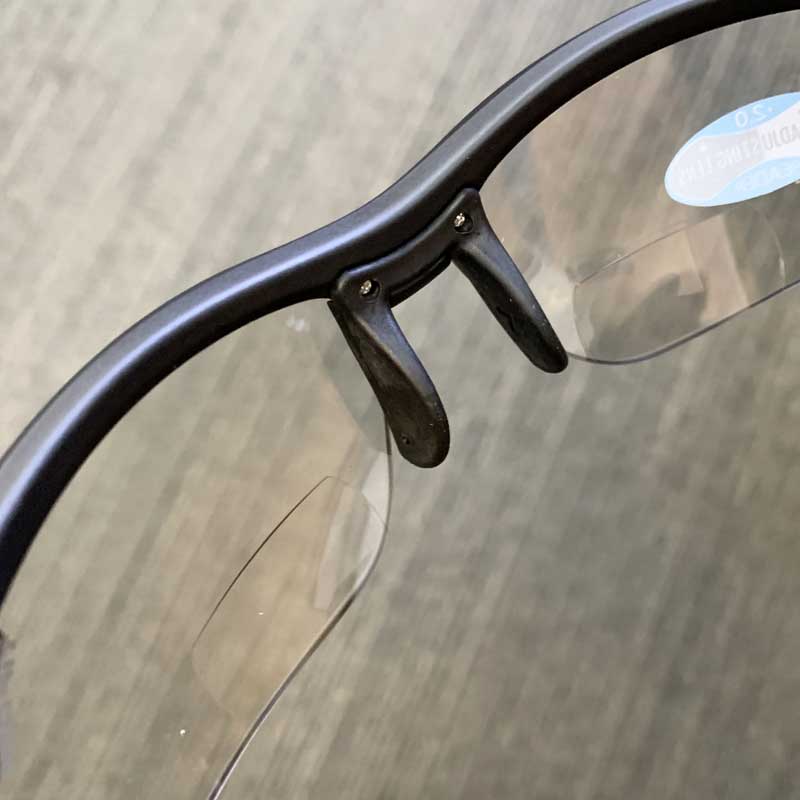 - レンズの下部分に一部拡大レンズをセット。(いわゆる老眼鏡ではなく、ハズキルーペのような拡大鏡です)一見何か貼ってあるように見せますが、レンズ自体の加工です。外側は全くフラットで、内側に少し段差があります。