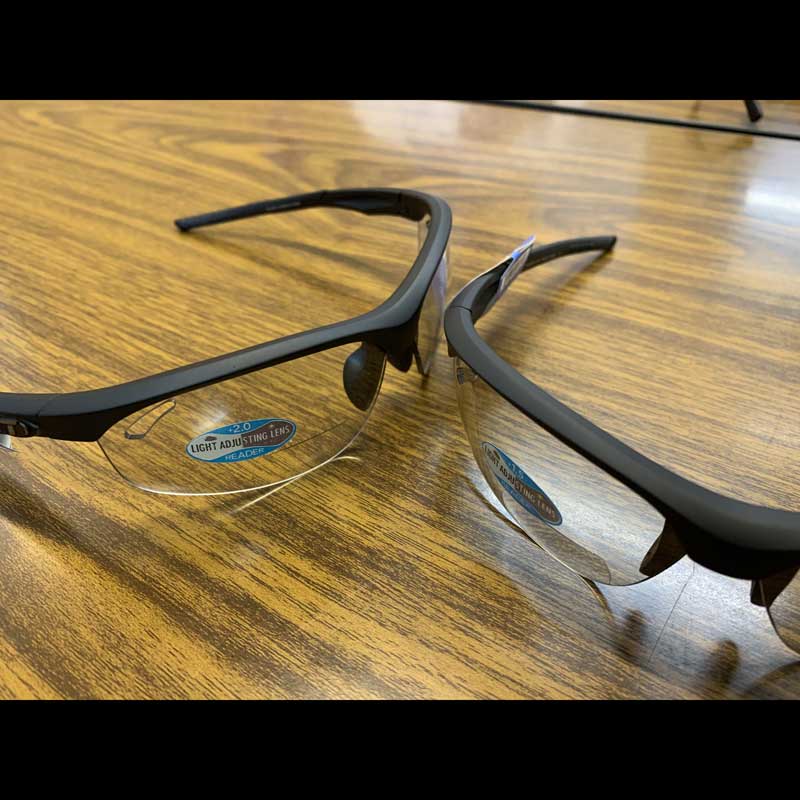 ハーフフレームに調光レンズ、さらに拡大鏡も装備。