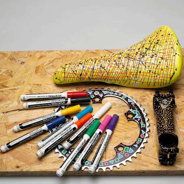 自転車のフレームはもちろんのこと、サドル、ホイールなどに手軽にペイントできます。また、自転車以外にもインラインスケート、ヘルメット、フリスビー、ラケット、バット、フットボール、膝/肩パッド、プラスチック、革、ビニールなどにも使用可能。