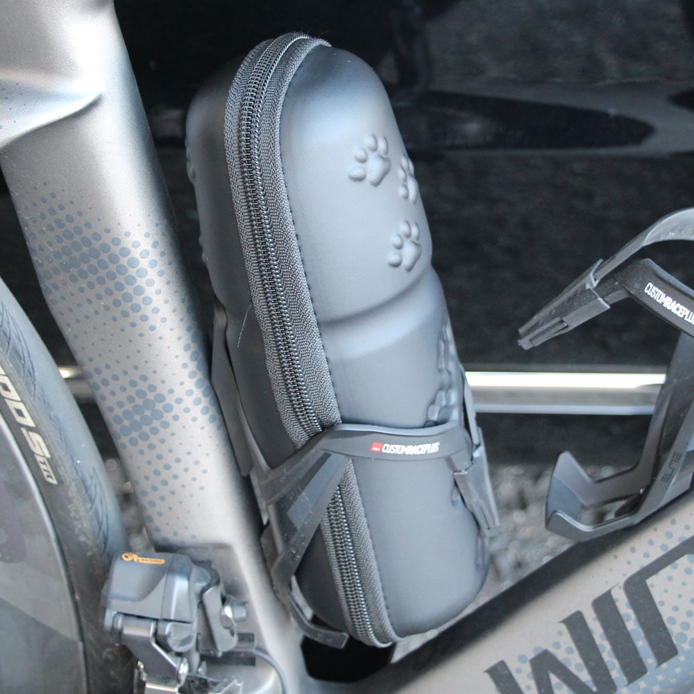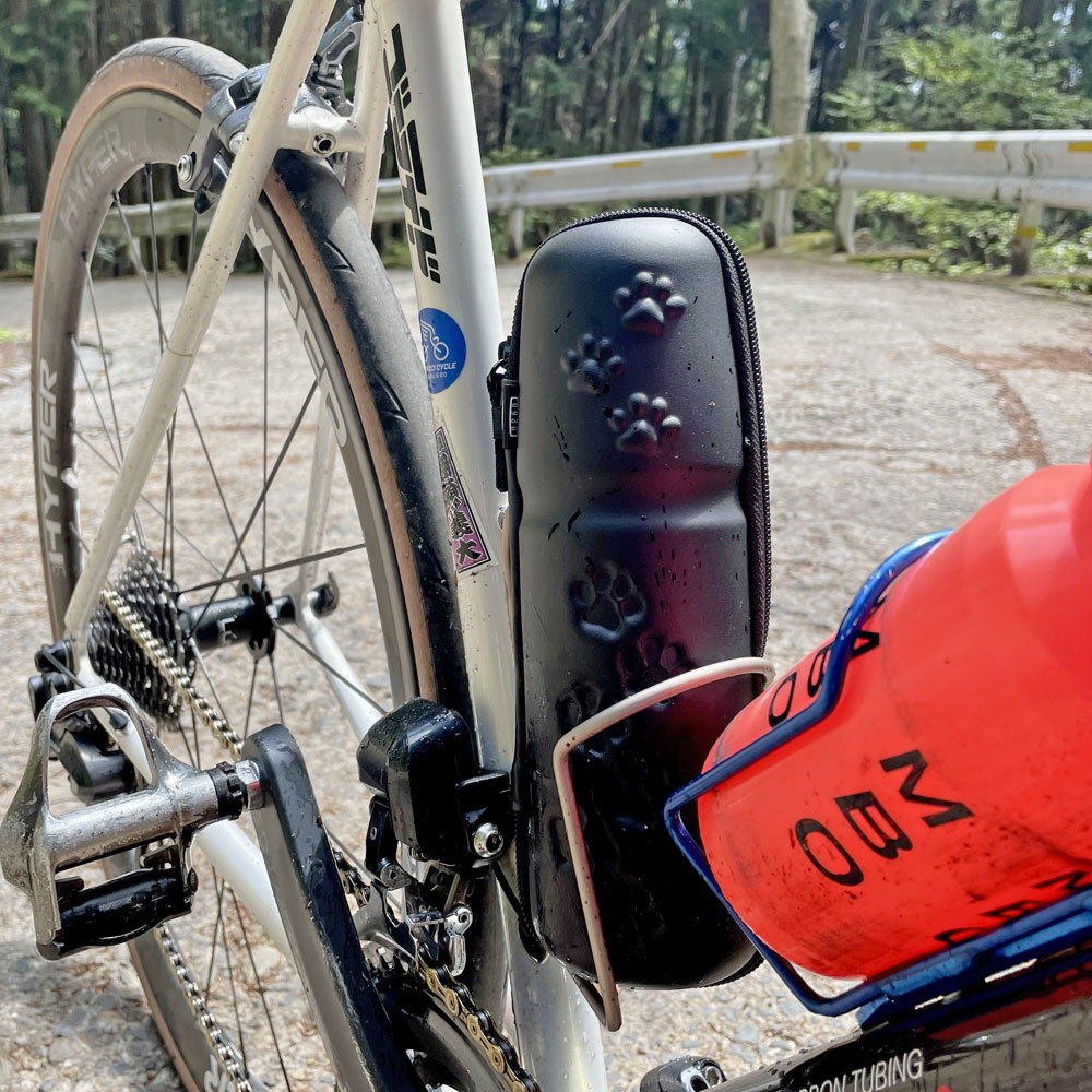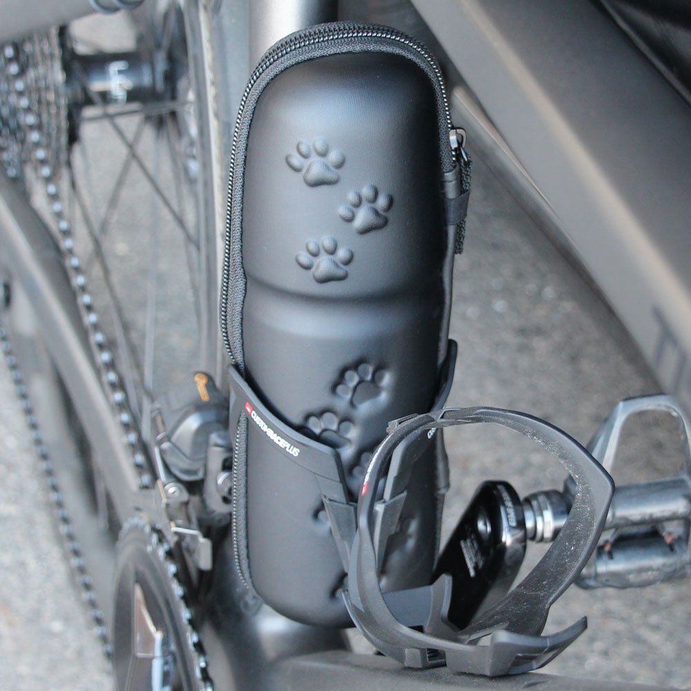 - 立体肉球が施された、スリムロングタイプのツールケース。シートチューブに取り付けたボトルケージに入れたとき脚が当たりにくいように、上端を少しだけスリムにデザイン。