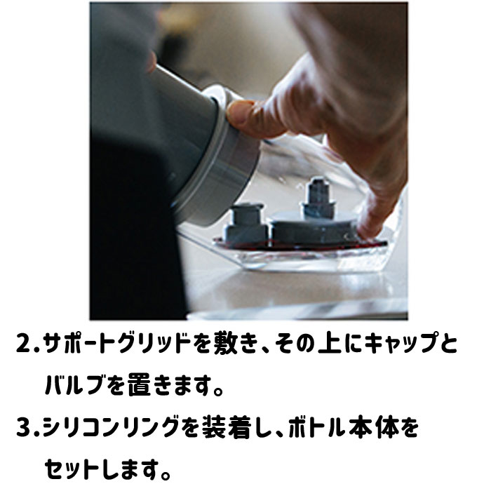 - キャップやバルブなどのパーツを置くためのサポートグリッドが付属します。
