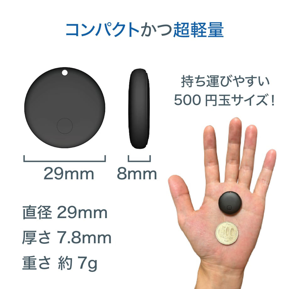 評価1評価2評価3評価4評価5子どもの自転車と通学バッグ、あと自分のクロスバイクに装着。サイズがコンパクトで軽量(約7g)なので付けっぱなしでも気になりません。iPhoneの「探す」で同時に場所を把握できるのが便利。