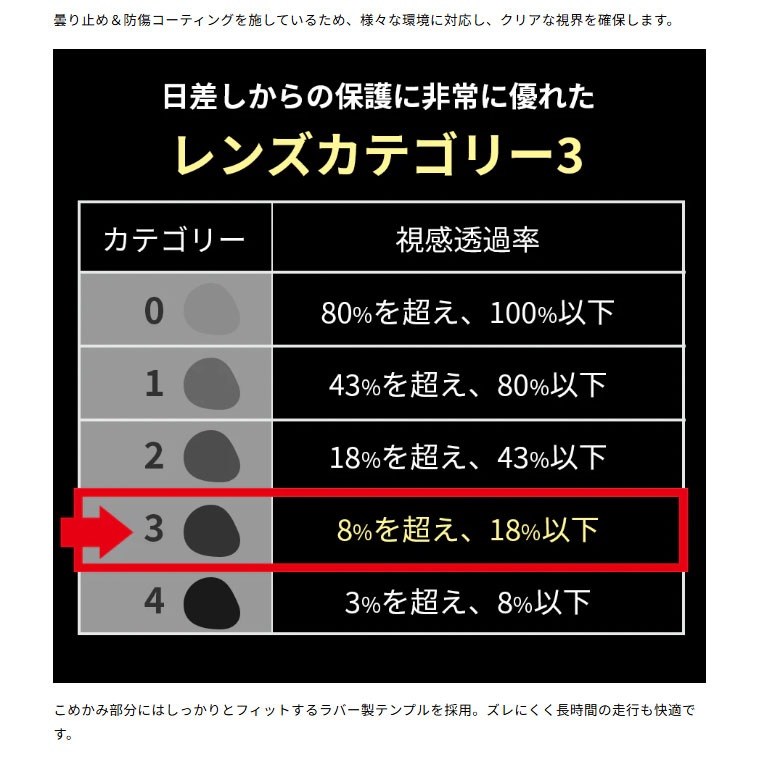 - UV400カット・耐衝撃・曇り止め・防傷コーティングで様々な環境に対応します。
