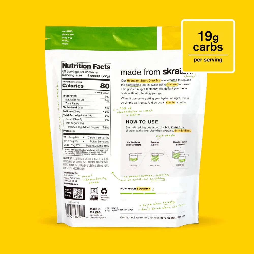 - Skratch ハイドレーション スポーツドリンクミックスは、汗で失われた電解質を補給し、運動中にほんの少しのエネルギーを補給するために開発されました。味覚や胃腸に負担をかけずに。私たちはスポーツドリンクを刷新し、アスリートの気分とパフォーマンスを向上させるために、安全に水分補給と喉の渇きを癒すために、必要最低限 の成分だけに絞りました。