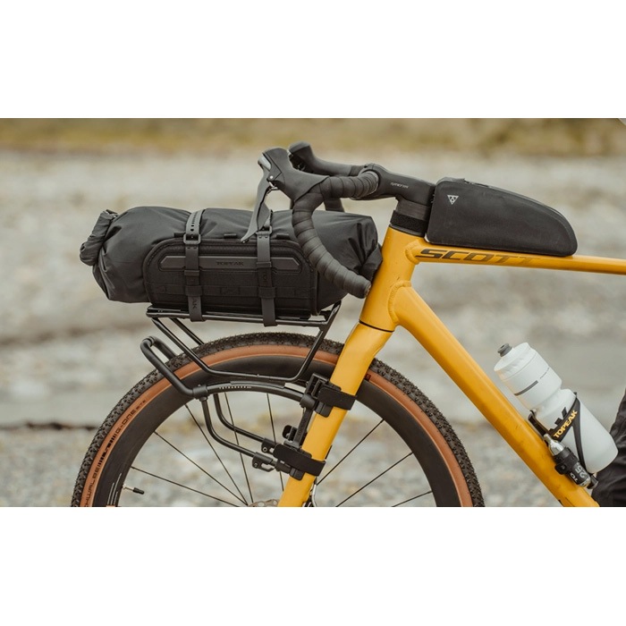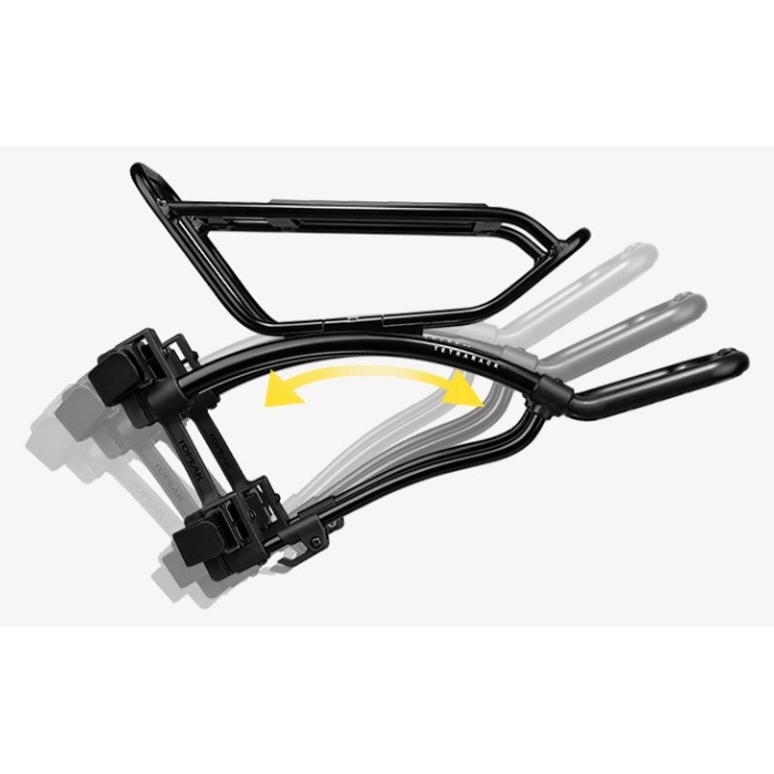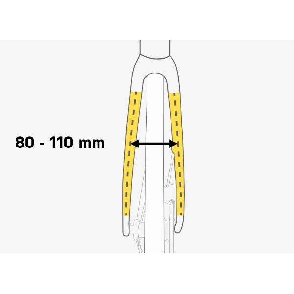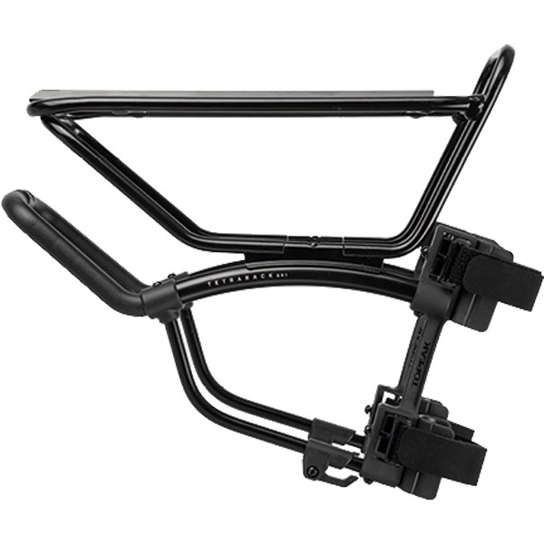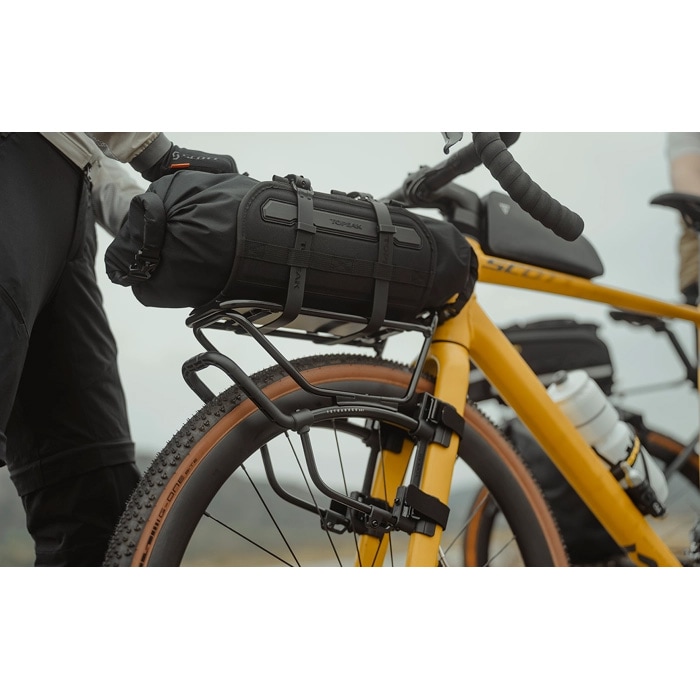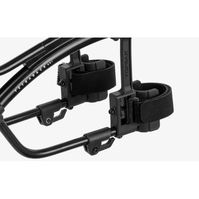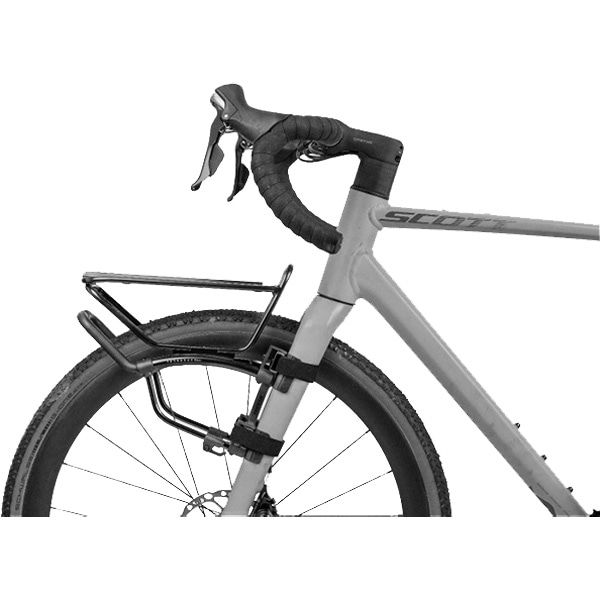 フロントフォークにダボ穴がないロードバイクやグラベルバイク向けのストラップオンタイプのフロントキャリアーです。