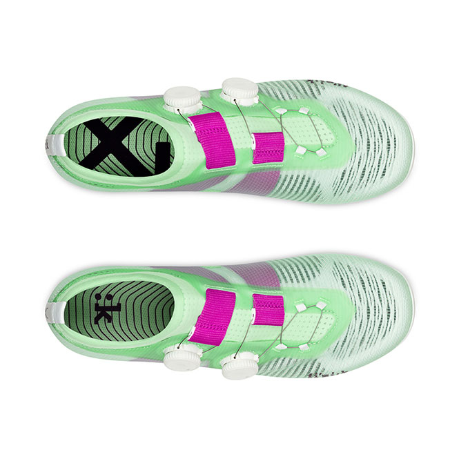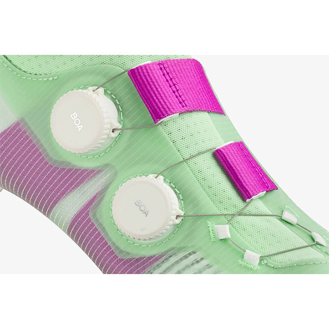 - 足の甲と中足部を独立して調整可能。2つのダイヤルがパネルに接続されており、足の内側を包み込むようにフィットします。これによりサイクリストは自分の足の形に合わせてシューズを細かく調整でき、長時間のライドでも最適なサポートを維持できます。